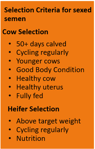 Accurate timing is critical for sexed semen – guideline is 12 to 20 hours after the start of standing heat.