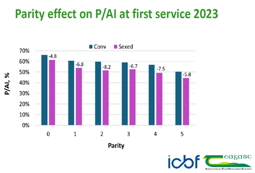Also displayed below is analysis from ICBF and Teagasc on national first service inseminations for heifers (Parity 0) and cows (Parity 1 – 5). There are 2 take away messages from this analysis.