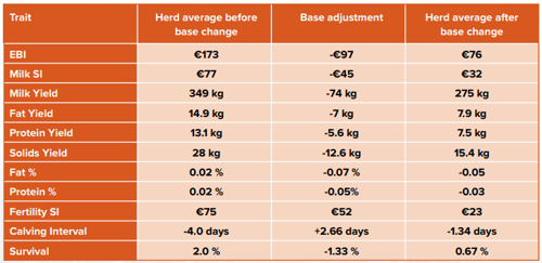 Because the EBI of all dairy animals has dropped (Table 1), this means that you need to adjust your selection criteria in line with these changes. For example, if you were previously selecting animals with a Fertility Sub-Index (SI) of €40 on the old evaluation, under the new base adjustment these animals will now be –€11 on the updated Fertility Sub-Index (SI). So this means that –€11 becomes your new cut-off if you want to maintain the same standard.