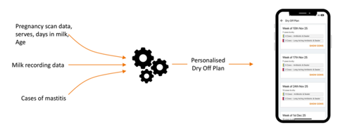 FarmOps uses milk recording data, data on clinical cases of mastitis, pregnancy scan data, serves, days in milk and age to choose the correct dry off plan for each individual cow.